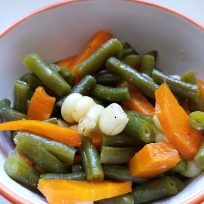 Mezcla de zanahoria, vainita y granos de choclo cocidos al vapor, servida tibia y aliñada ligeramente. Ideal para acompañar platos criollos o a la parrilla.