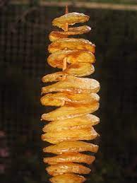 Papa frita en espiral sobre palito, crujiente y perfecta para niños o presentaciones llamativas.